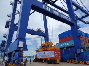 Batam, [GT] – Badan Pengusahaan (BP) Batam melaksanakan pengiriman kontener langsung (Maiden Voyage) dengan MV SITC Hakata Voy 2407 N Direct Call Batam – China di Pelabuhan Peti Kemas Batu Ampar, Batam, Minggu (31/3/24).