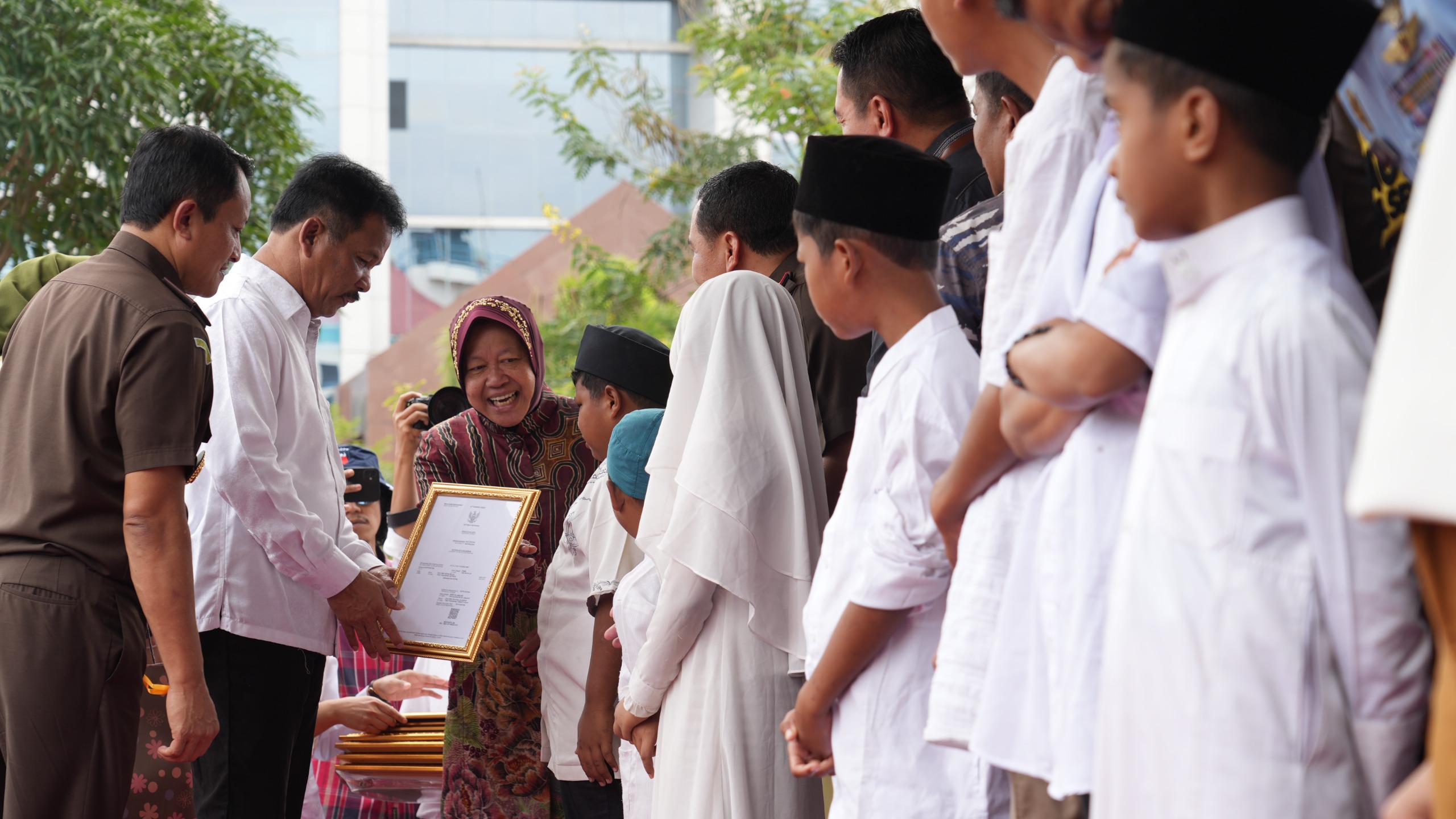 Pada kesempatan ini, Tri Rismaharini menyerahkan dokumen kependudukan berupa Akta Kelahiran dan Kartu Identitas Anak (KIA) secara simbolis kepada perwakilan anak naungan LKSA di halaman Kantor Kejaksaan Negeri Batam.