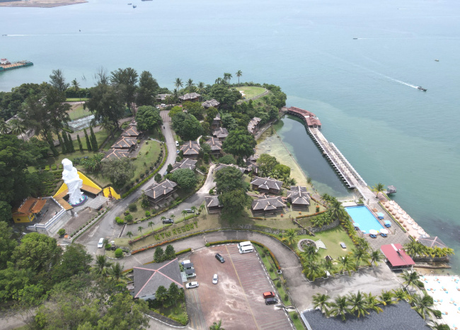 Dari landscap udara, resort ini terlihat begitu memanjakan mata. Deretan vila bernuansa tropis berdiri rapi di tepian laut dengan panorama langsung menghadap perairan Selat Malaka yang sibuk sebagai sub logistik internasional.