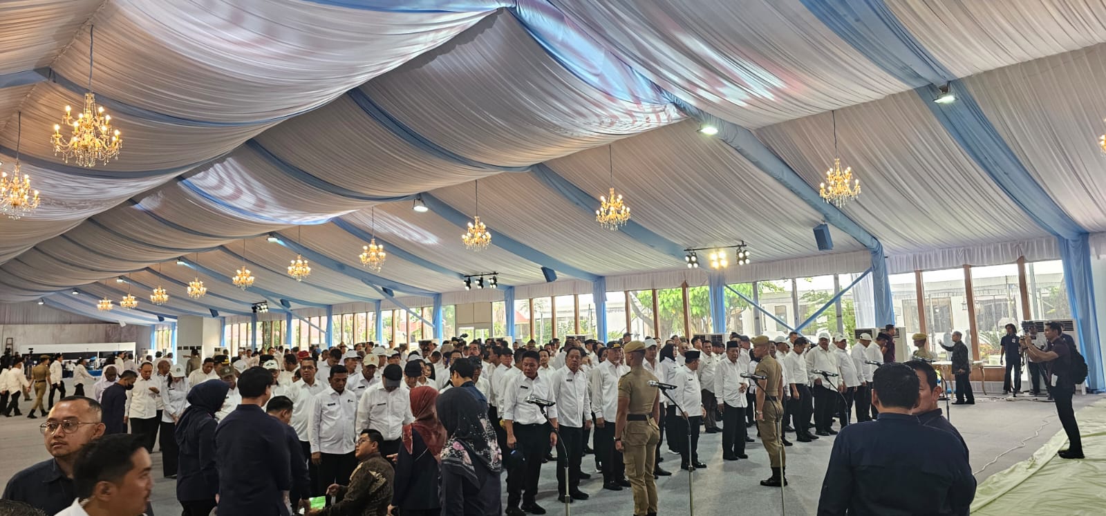 Gubernur dan Wakil Gubernur Kepri terpilih Ansar Ahmad dan Nyanyang Haris telah hadir di lokasi, mengenakan pakaian hitam putih yang menambah kesan khidmat dalam persiapan pelantikan besok.